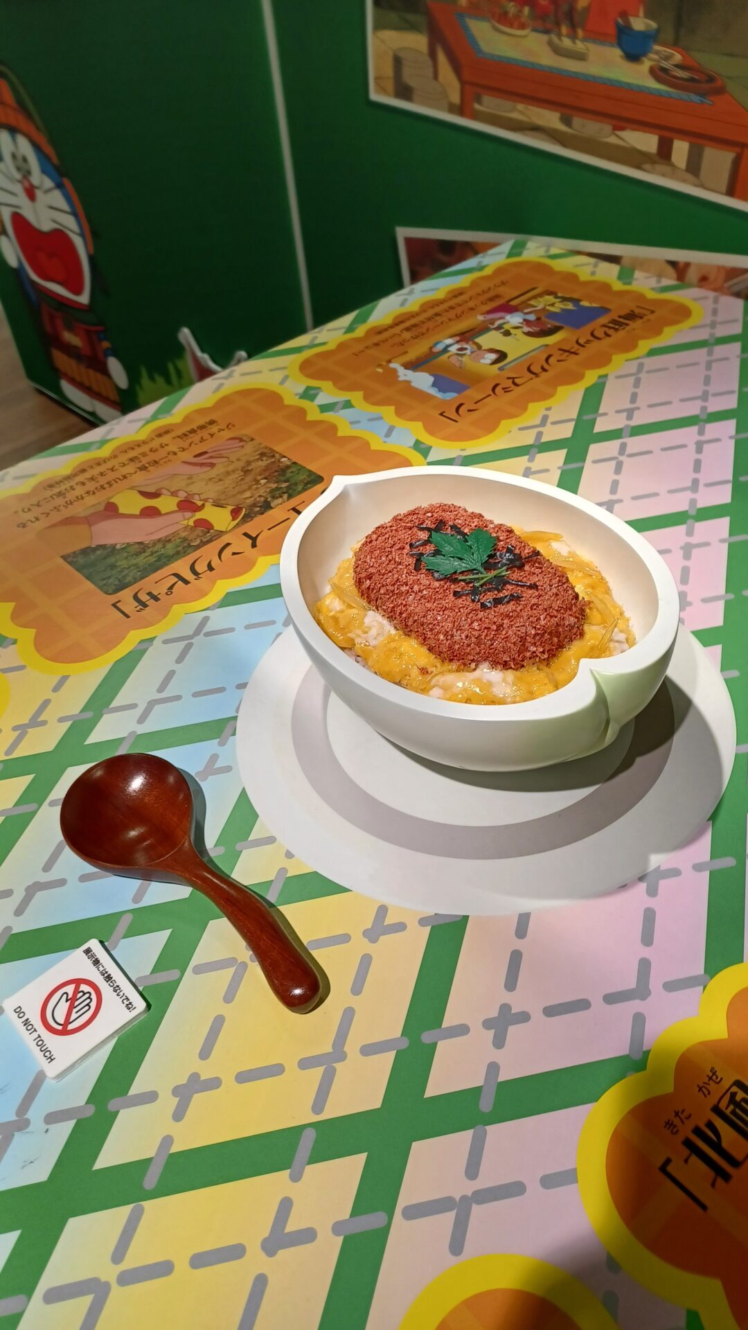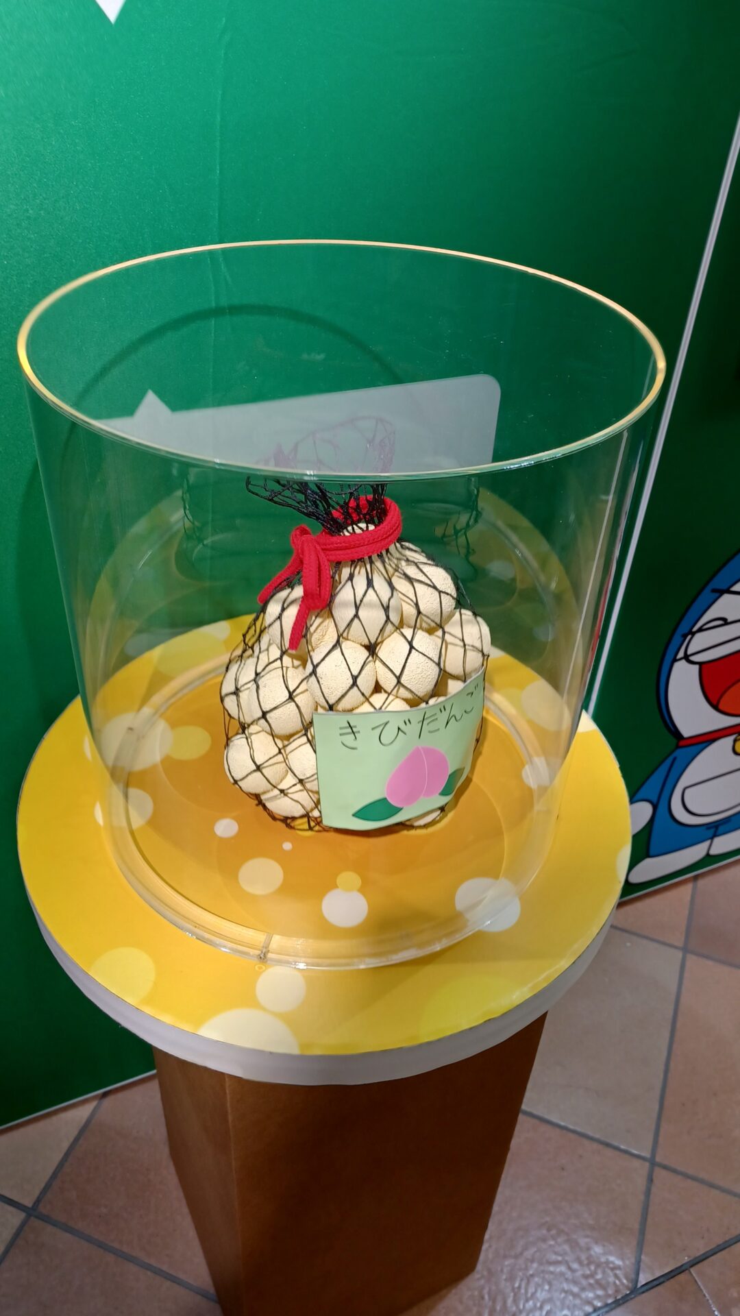 各ブースの入り口付近にはひみつ道具のオブジェが! 最初は桃太郎印のきびだんごでした。