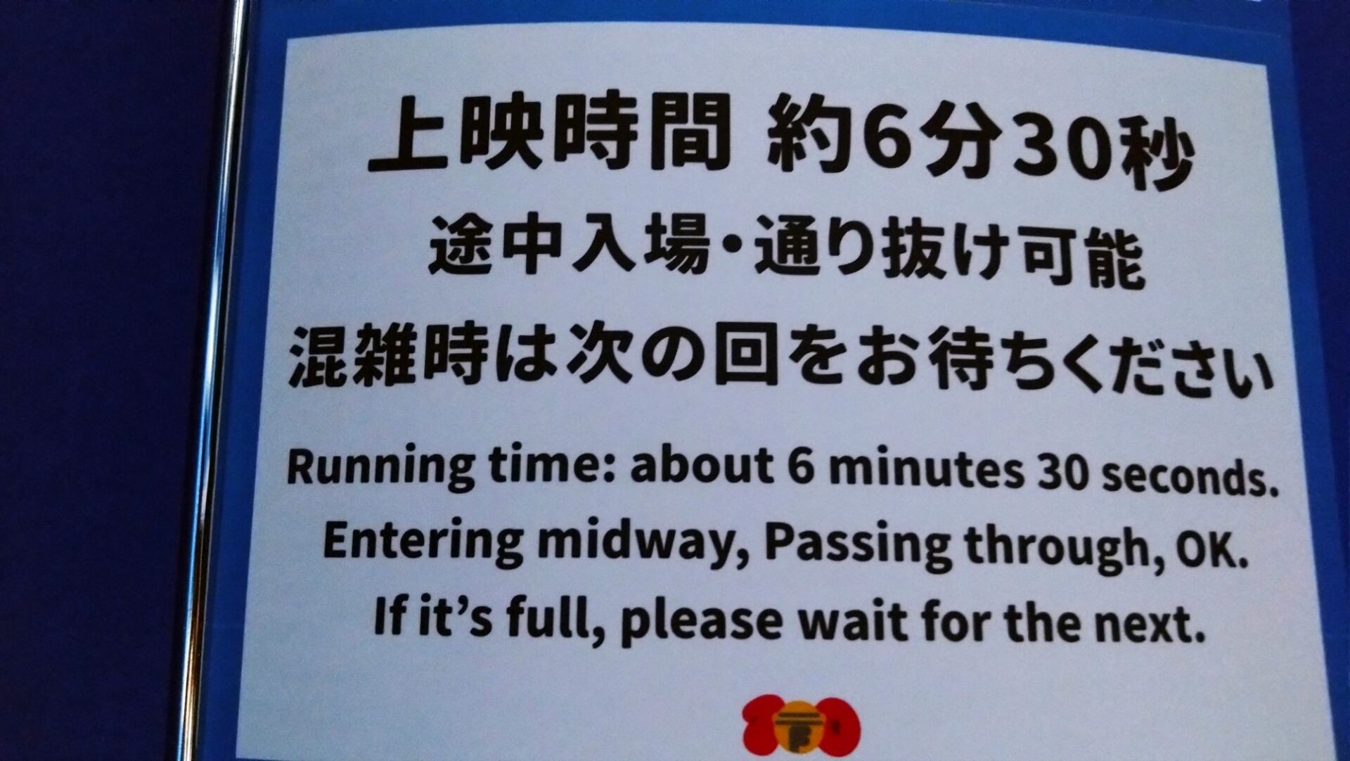 この上映される部屋は入れ替え制で、上映中の場合は待たされます。が、防音ではないので音声だけ丸聞こえです。ネタバレされると取るか、音声だけなら何度も聞けると思うとか、きみはどっちだ!?